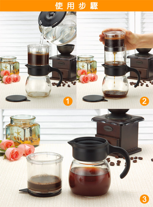 放入適量的茶葉或咖啡粉,然後注入熱水(沖泡咖啡無須再使用過濾紙),經過適當的時間後將沖泡壺之內杯拿起,茶葉、咖啡渣將保留在內杯內,而茶水、咖啡將自動流入玻璃壺中,方便、簡易的沖泡方式,讓你無論是沖泡茶葉或是咖啡都輕而易舉。
